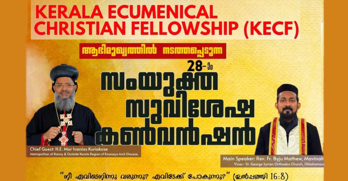 ഡാലസ്: കേരള എക്യുമെനിക്കൽ ക്രിസ്ത്യൻ ഫെലോഷിപ് (കെഇസിഎഫ്) വാർഷിക കൺവൻഷൻ ഓഗസ്റ്റ് ഒന്ന് മുതൽ മൂന്ന് വരെ തീയതികളിൽ നടക്കുമെന്ന് ഫെലോഷിപ് സെക്രട്ടറി അലക്സ് അലക്സാണ്ടർ അറിയിച്ചു. എല്ലാ ദിവസവും വൈകുന്നേരം ആറ് മുതൽ ഒൻപത് വരെയാണ് ശുശ്രൂഷകൾ.
