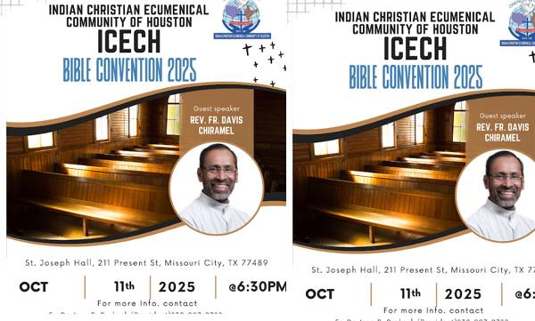 ഹൂസ്റ്റൺ: ഇന്ത്യൻ ക്രിസ്ത്യൻ എക്യൂമെനിക്കൽ കമ്മ്യൂണിറ്റി ഓഫ് ഹൂസ്റ്റൺ (ICECH) ആഭിമുഖ്യത്തിൽ 2025-ലെ ബൈബിൾ കൺവെൻഷൻ ഹൂസ്റ്റൺ സെന്റ് ജോസഫ് സീറോ മലബാർ കാത്തലിക് ദേവാലയ ഹാളിൽ ഒക്ടോബർ 11-ാം തീയതി ശനിയാഴ്ച നടത്തപ്പെടുന്നു. വൈകുന്നേരം 6:30 യ്ക്ക് കൺവെൻഷൻ ആരംഭിക്കും