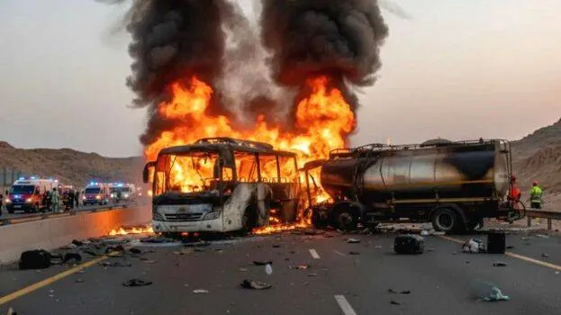 45 ഇന്ത്യൻ തീർത്ഥാടകർക്ക്  സൗദിയിൽ  ദാരുണാന്ത്യം,​ ടാങ്കറുമായി  കൂട്ടിയിടിച്ച ബസ്  കത്തിയമർന്നു